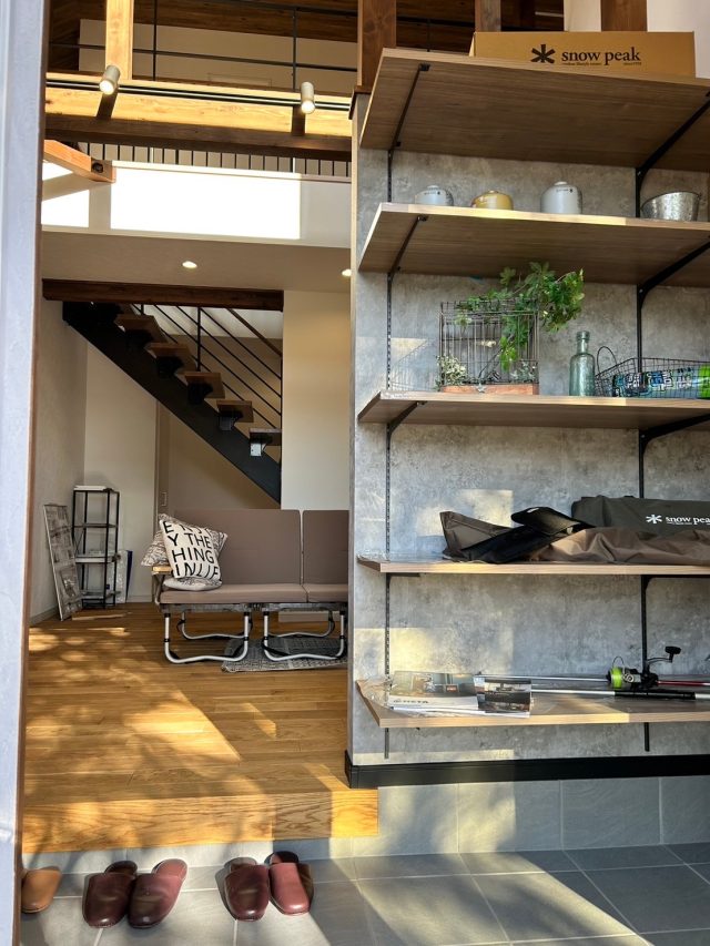 玄関からアウトドアギアなどを収納する土間収納を通ってリビング前までつながる通り土間。